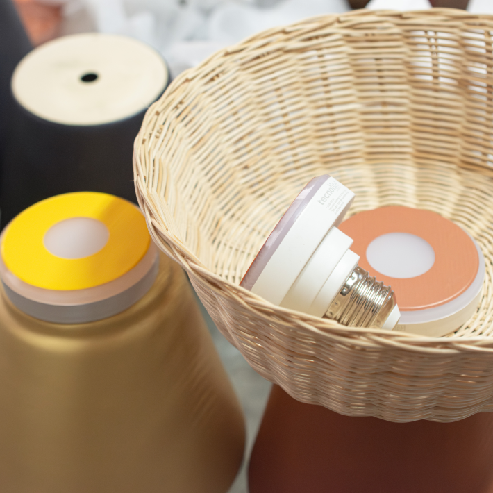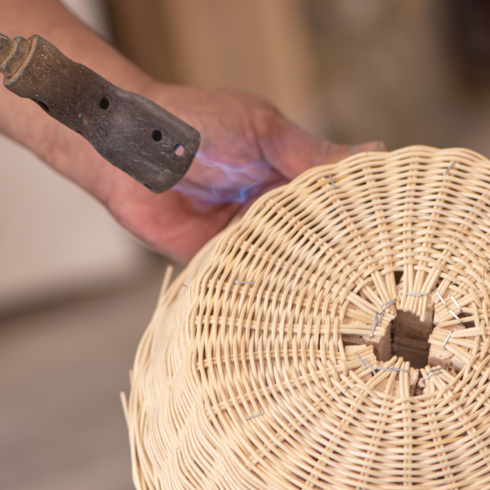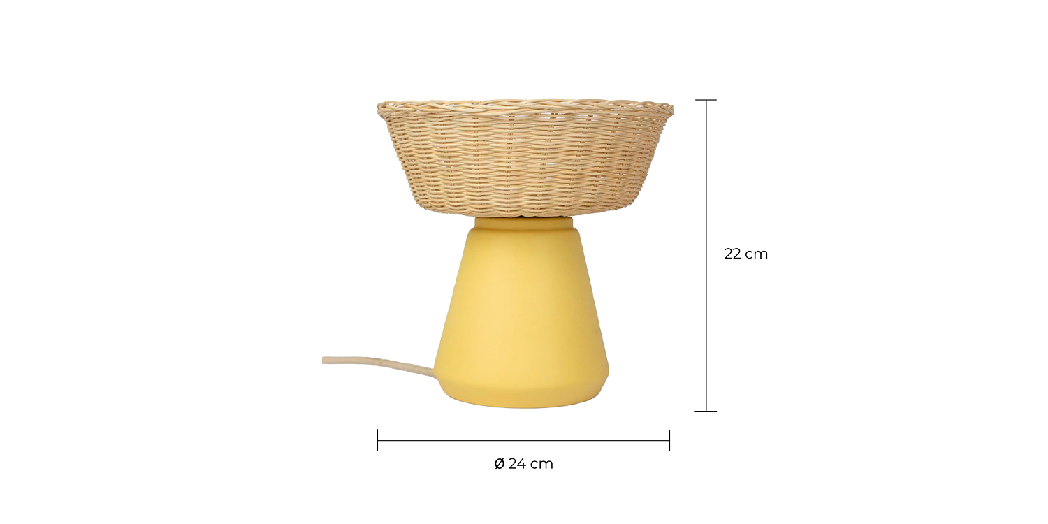 La cerámica de alta temperatura, moldeada con precisión, aporta solidez, estabilidad y una superficie limpia que garantiza durabilidad y control formal. El mimbre de 3 mm, tejido artesanalmente con acabado mate y forma de cesto, introduce ligereza, flexibilidad y una textura orgánica que permite el paso sutil de la luz.