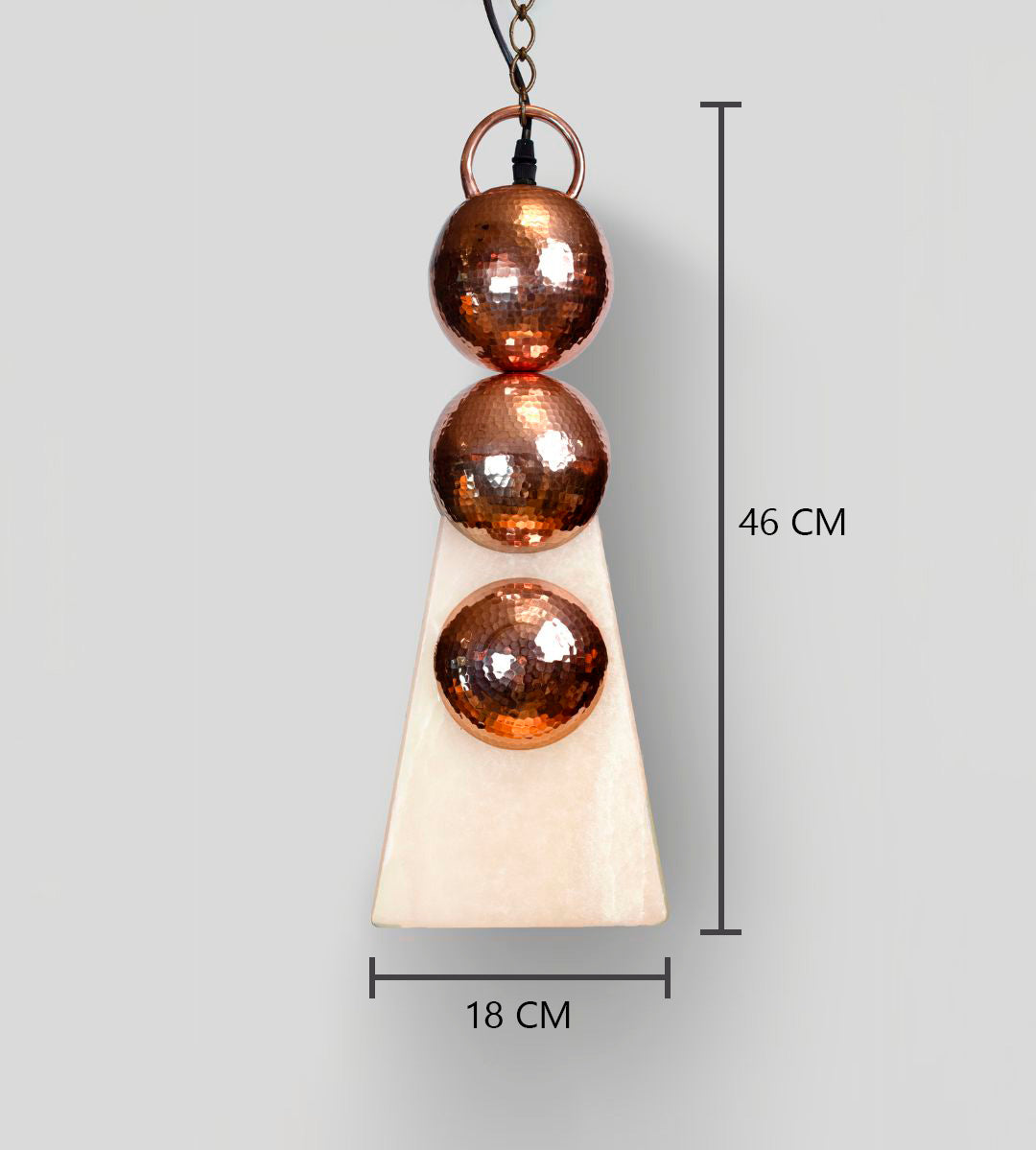 Halo de tres esferas en parota, representa la calidez terrenal y la energía que asciende desde la raíz. Tres esferas verticales de madera natural conducen el flujo de la luz hacia la base de ónix, evocando la unión entre la tierra, el hombre y el cosmos. Su textura orgánica y el brillo sutil del acabado semi mate revelan el pulso vital del material. Suspendida por un aro superior de cobre martillado, esta luminaria es símbolo de equilibrio y conexión con lo esencial.