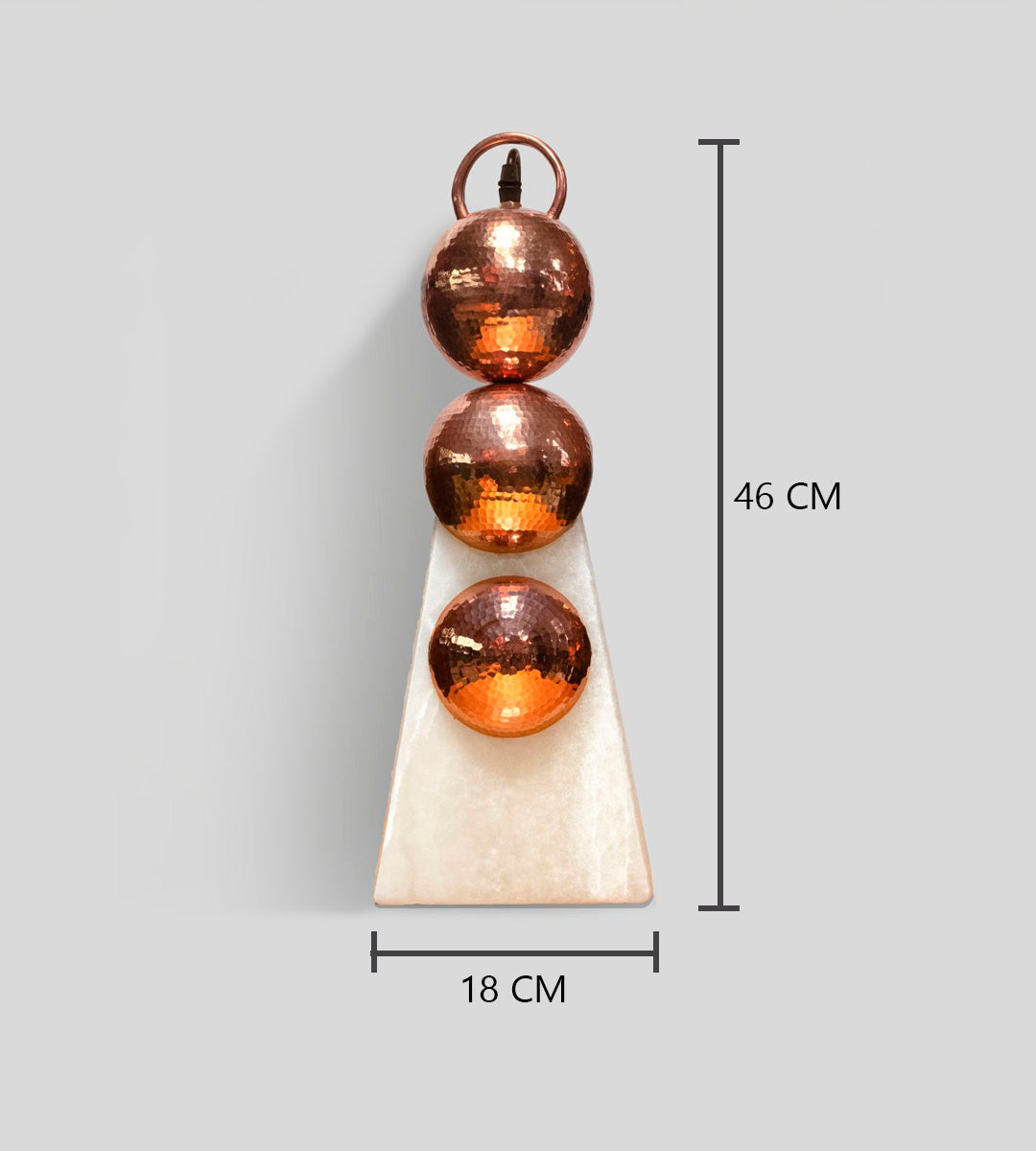 El cobre martillado brillante de Santa Clara del Cobre y el ónix de San Luis, tallado y esmerilado a mano en Tecali de Herrera, Puebla, se unen en esta luminaria como una expresión de materia y oficio. El cobre conserva las huellas del martillo que reflejan la luz y revelan su carácter artesanal.
