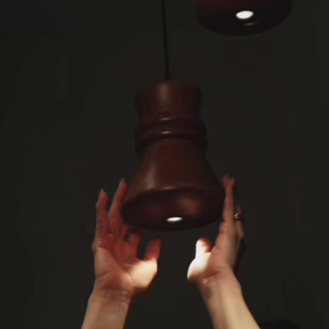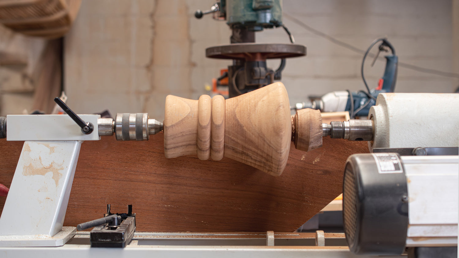 La madera de parota, torneada a mano en torno y acabada en un tono semimate, revela su carácter natural a través de vetas orgánicas y una textura cálida al tacto. En su interior, las perforaciones de vaciado y barrenado se realizan mediante técnicas de carpintería de alta precisión, apoyadas en plantillas y moldes que garantizan uniformidad y control sin perder el carácter artesanal.