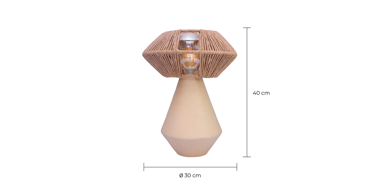 La base está elaborada en cerámica moldeada y cocida en horno de alta temperatura, proceso que le otorga resistencia, densidad y un acabado suave en color beige. La pantalla está compuesta por una estructura de acero redondo tropicalizado, forrada y tejida a mano con cordón de cartón crochet. Este tejido artesanal suaviza la luz y crea un efecto envolvente, generando un diálogo entre la solidez mineral de la cerámica y la ligereza textil del entramado. La unión de ambos materiales da como resultado una luminaria equilibrada, donde lo orgánico y lo estructural conviven con naturalidad y carácter.