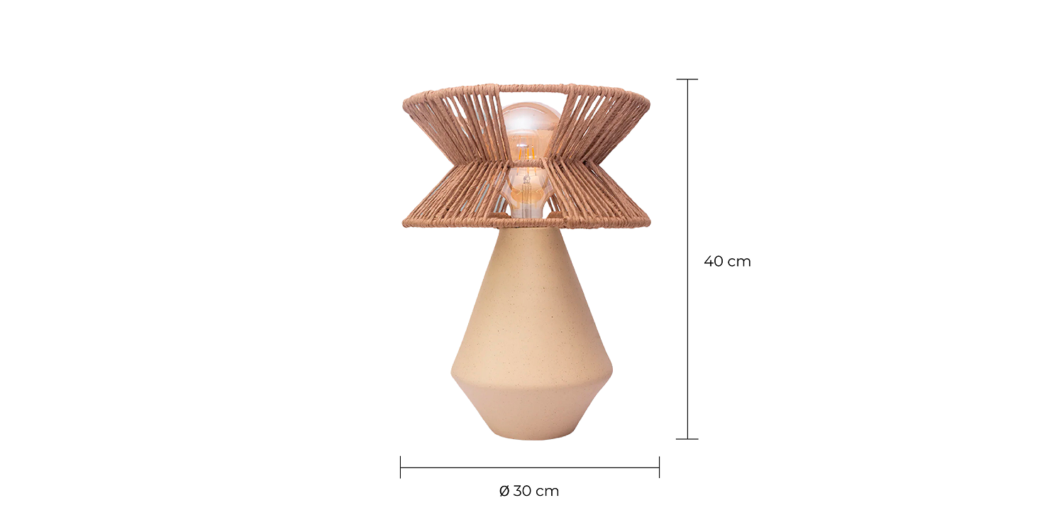 La base está elaborada en cerámica moldeada y cocida en horno de alta temperatura, proceso que le otorga resistencia, densidad y un acabado suave en color beige. La pantalla está compuesta por una estructura de acero redondo tropicalizado, forrada y tejida a mano con cordón de cartón crochet. Este tejido artesanal suaviza la luz y crea un efecto envolvente, generando un diálogo entre la solidez mineral de la cerámica y la ligereza textil del entramado. La unión de ambos materiales da como resultado una luminaria equilibrada, donde lo orgánico y lo estructural conviven con naturalidad y carácter.