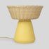 Lámpara de mesa de cerámica en tono amarillo suave y mimbre natural, con un diseño armónico y balanceado. Cada pieza se elabora artesanalmente mediante moldeado y cocción en horno de alta temperatura. Su pantalla de mimbre natural, tejida a mano en forma de cesto, evoca el trabajo artesanal tradicional.