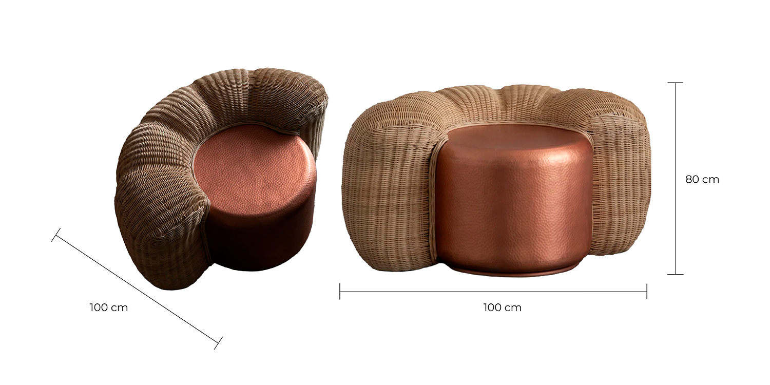 El mimbre, entrelazado fibra a fibra, aporta calidez táctil y una presencia orgánica que suaviza la contundencia del cobre. El diálogo entre ambos materiales da forma a una pieza única, donde cada detalle honra el oficio y la belleza de lo hecho a mano.