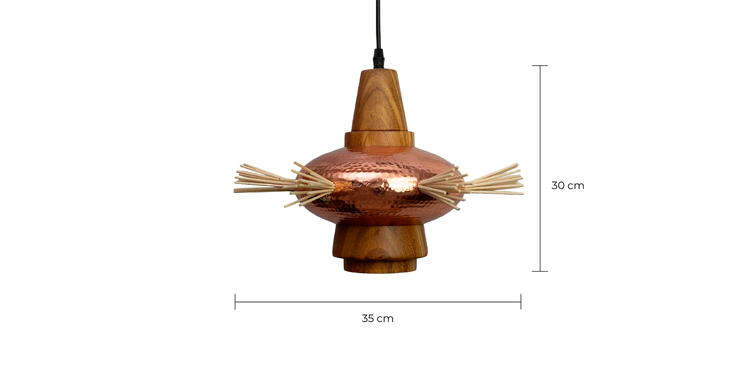 El cobre martillado de Santa Clara del Cobre y la madera de parota torneada a mano se unen en esta luminaria como una celebración del oficio y la materia natural. El cobre, noble y duradero, conserva las huellas del martillo que hacen de cada pieza un objeto único, ya sea en su acabado natural o en sus distintas pátinas.