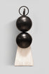 Cátodo de dos esferas en encino negro, es una pieza introspectiva que guarda la luz en su interior. Las esferas oscuras contrastan con el brillo lechoso del ónix, creando una composición que sugiere la coexistencia entre sombra y claridad. Su acabado negro mate y su proporción vertical invitan a la pausa, mientras el aro superior, convertido en asa, transforma la lámpara en un objeto ritual de contemplación.